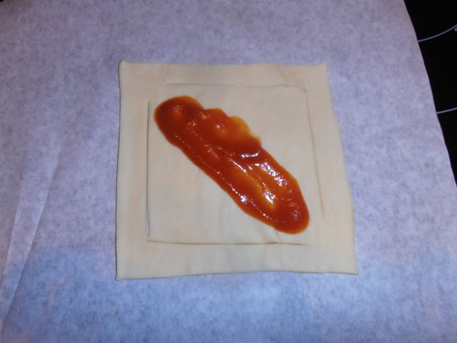 cortar la masa de hojaldre en forma de cuadrado y hacer un corte en el interior como en la foto